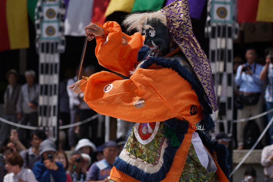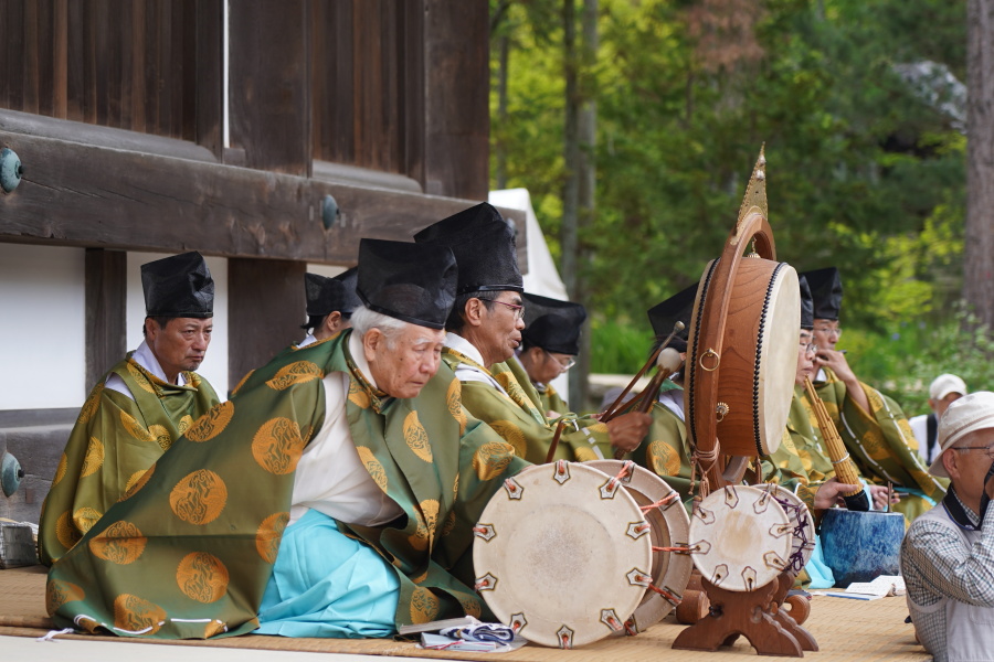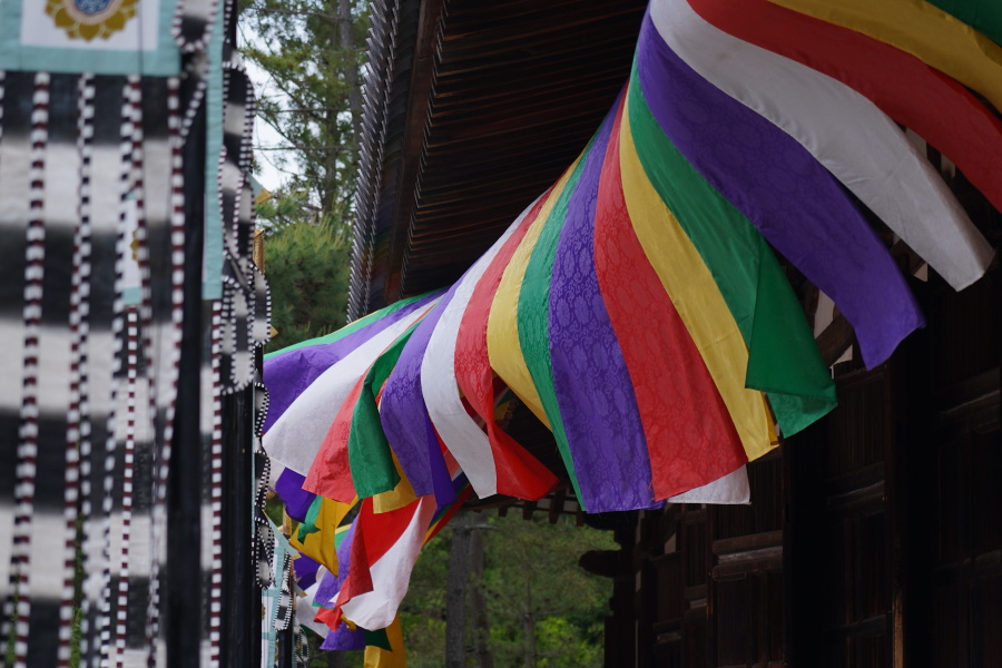 いつもは静かなお寺にもこのときは五色の幕がかかり、講堂前では雅楽が奉納されるなど大変にぎやかです。