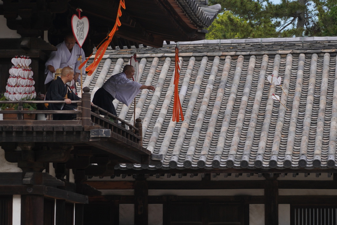 うちわまきは夕方の3時から行われ、太鼓の音に合わせて鼓楼から僧侶が団扇をまきます。